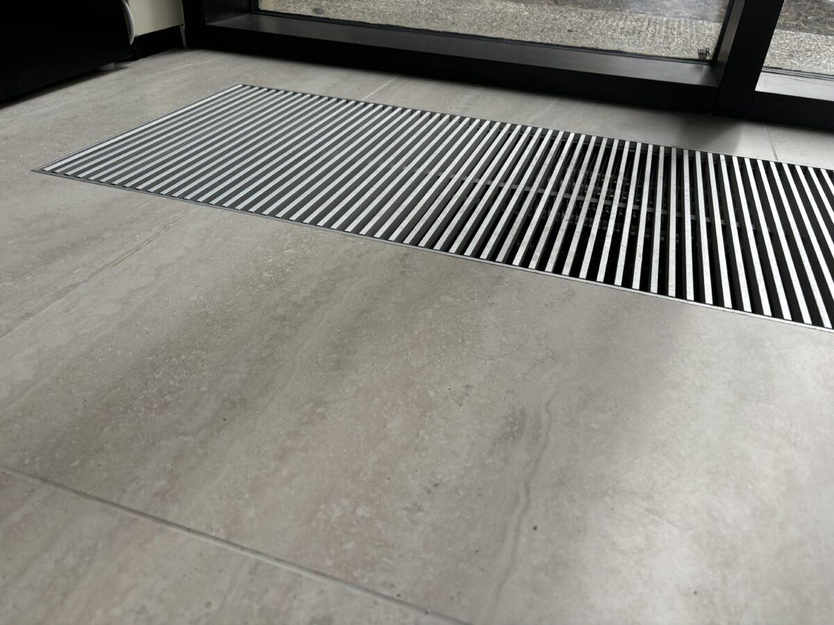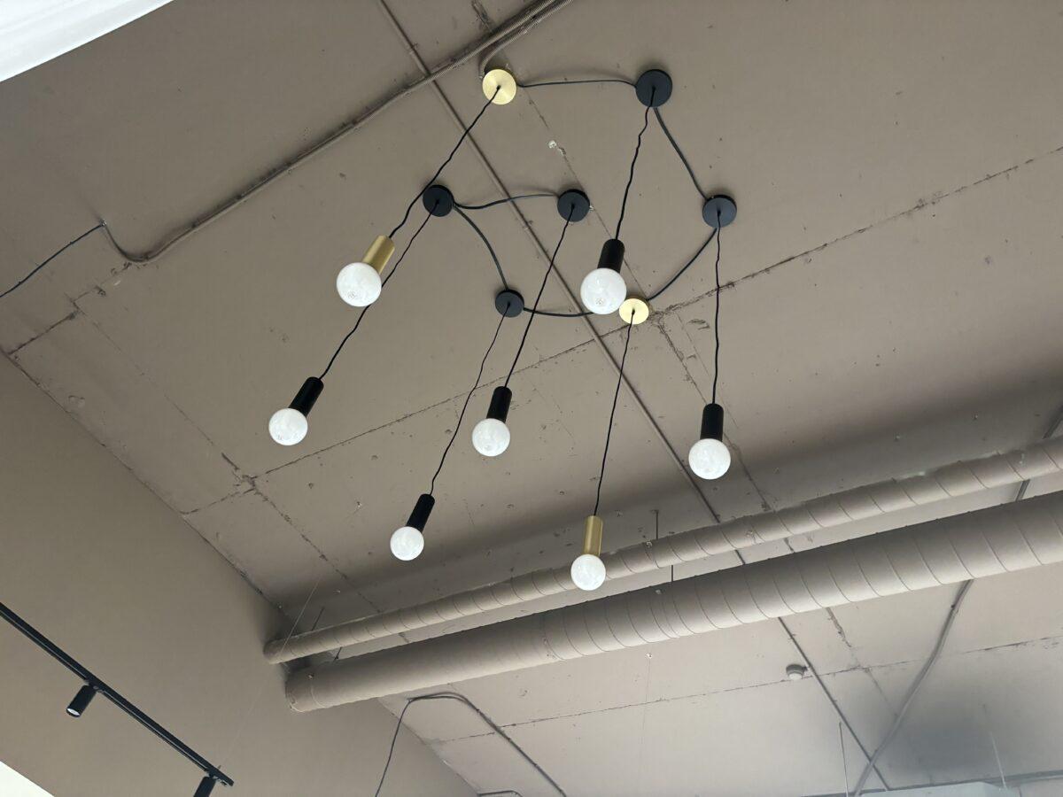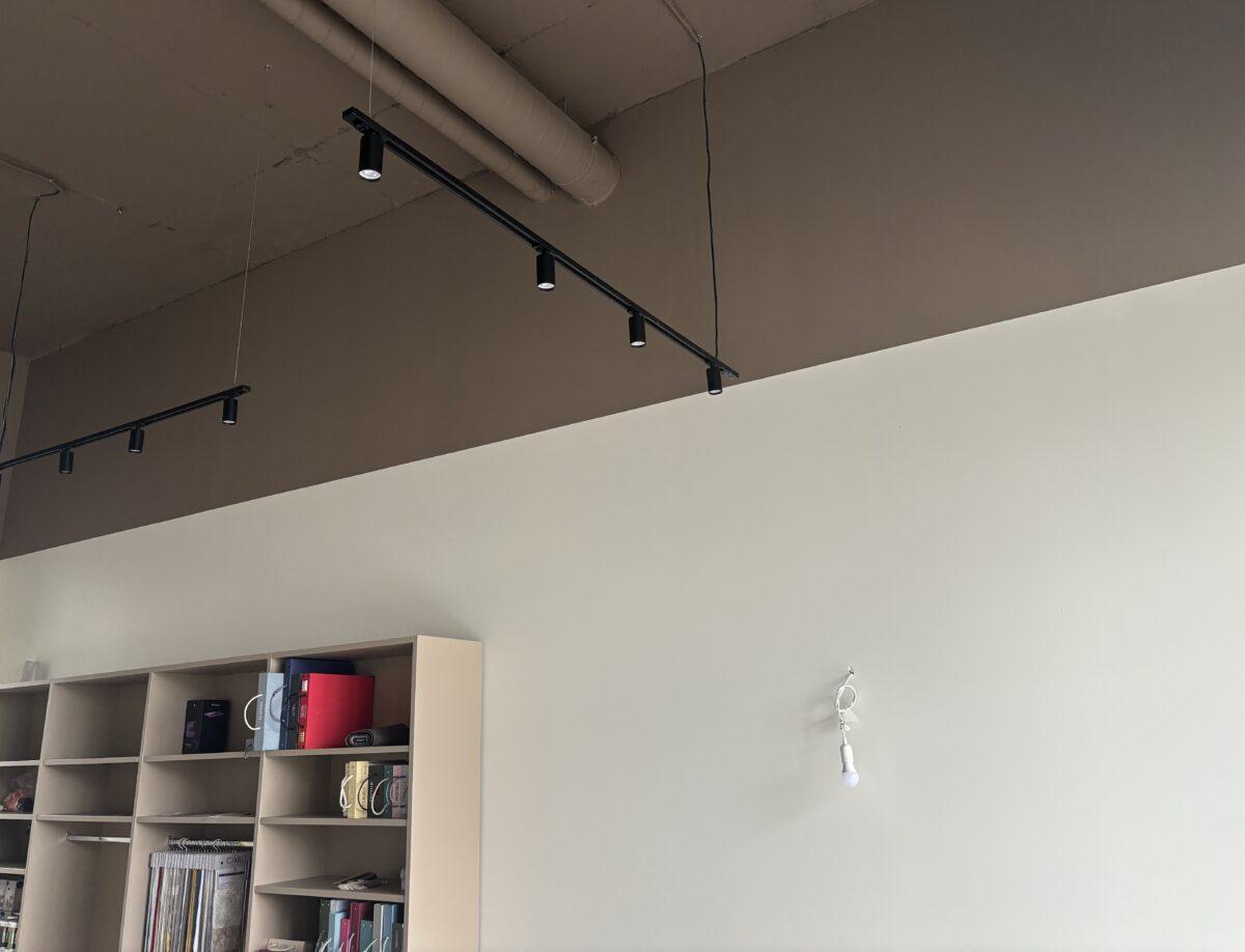 Потолок в салоне оформлен в стиле лофт с открытыми коммуникациями, что добавляет лёгкий индустриальный акцент. Лаконичные трековые светильники позволяют гибко управлять освещением: можно выделить определённые зоны или акцентировать внимание на новых коллекциях текстиля.