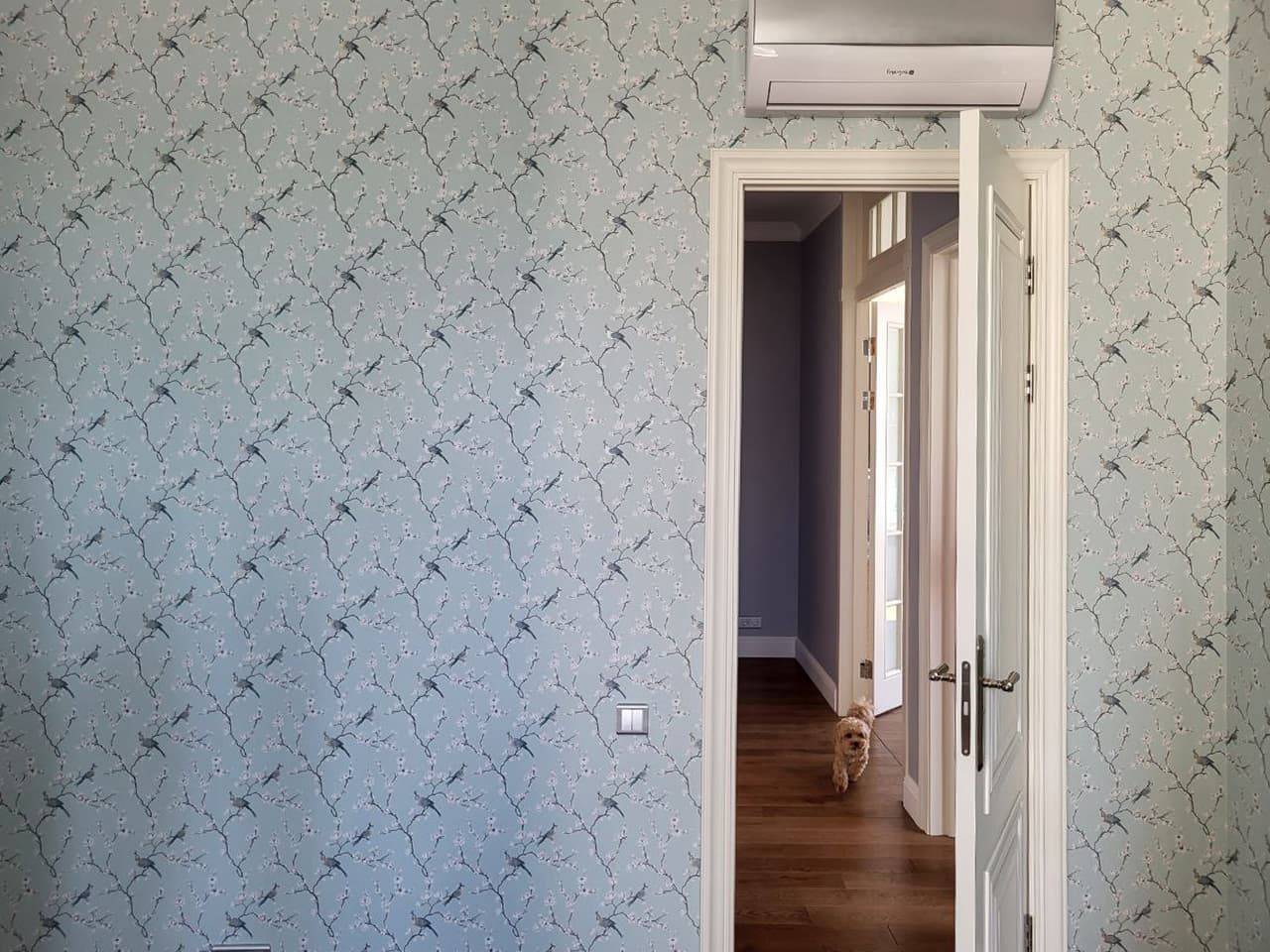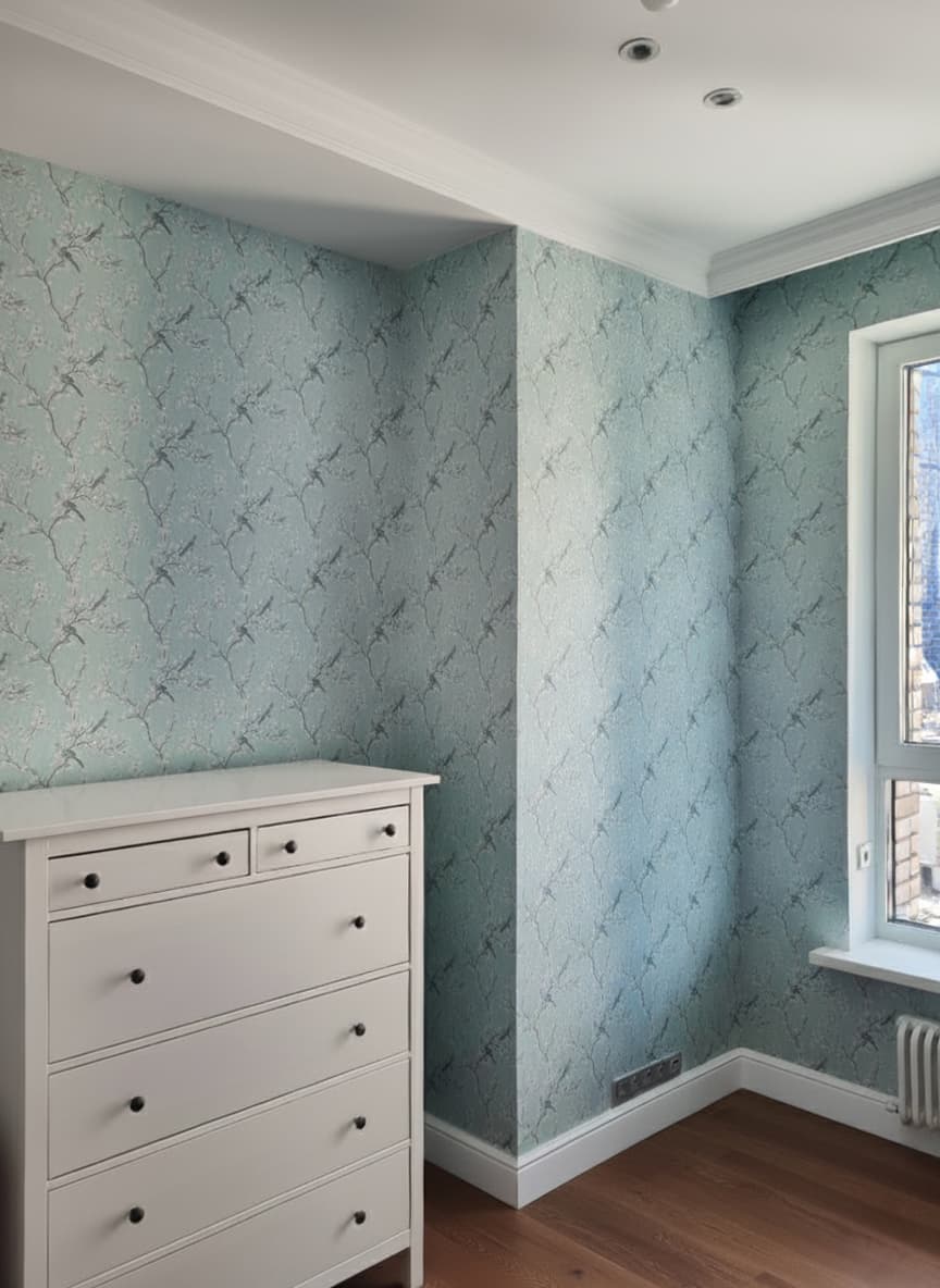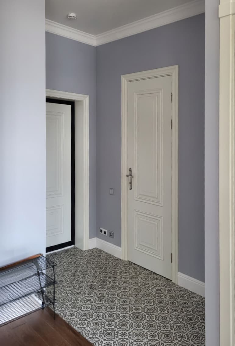 Основная отделка — акриловая краска Swiss Lake в спокойных светло-серых оттенках. Потолки украшены лепниной, классическими галтелями и плинтусами из дюрополимера, которые подчеркивают высоту помещений. На полу — инженерная доска, выложенная в хаотичном порядке из досок разной длины, благодаря чему пол выглядит живо и натурально.