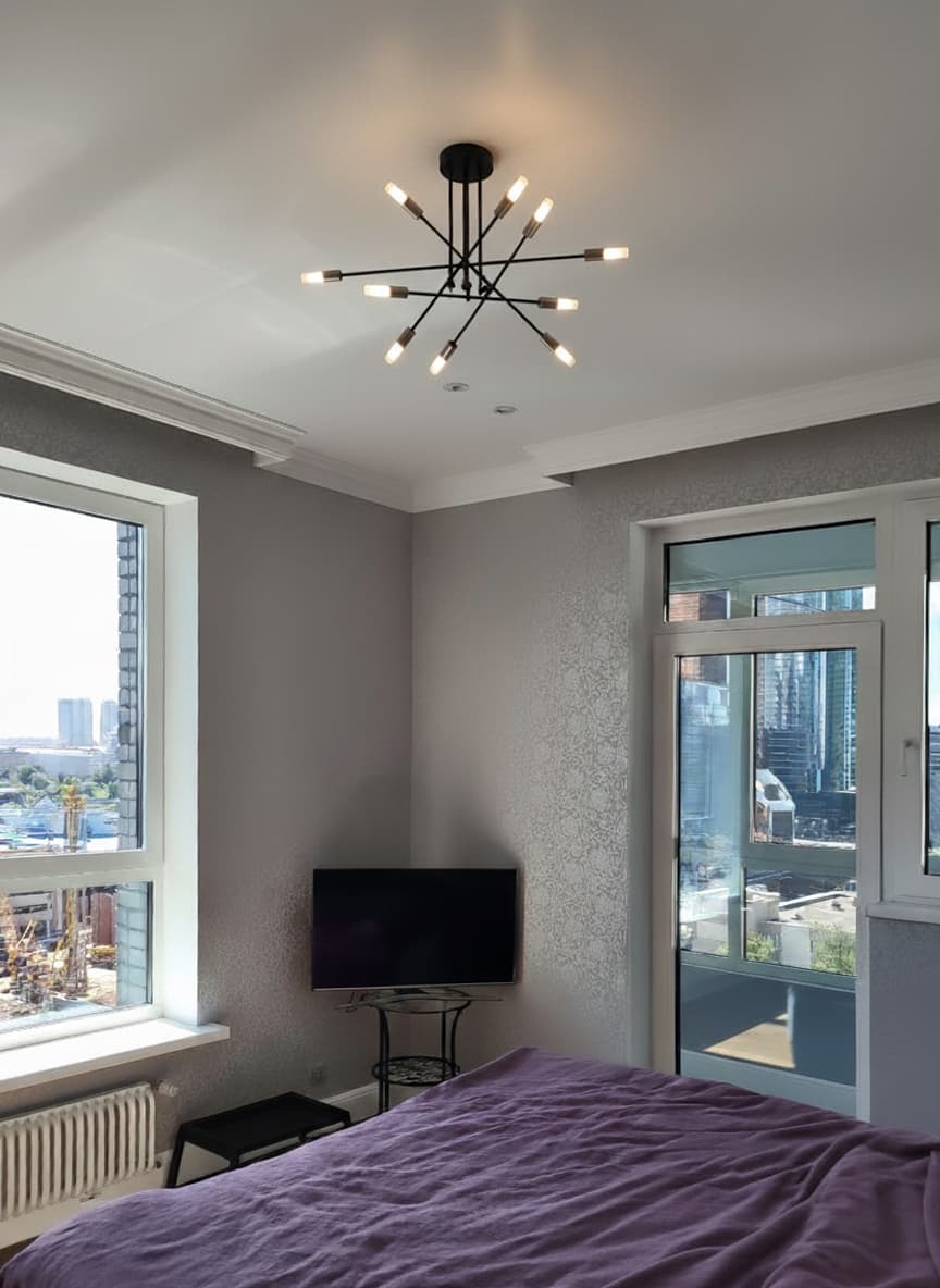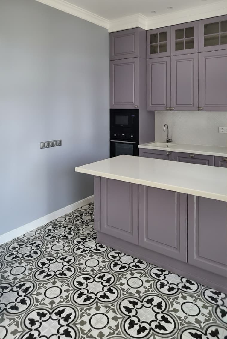 Во всей квартире реализована система «тёплый пол» с управлением по Wi-Fi — всё включается и регулируется прямо с телефона. В кухонной зоне потолок выполнен из гипсокартона, при этом мы максимально “прижали” его к бетонному перекрытию, чтобы сохранить объём и визуальную высоту помещения.