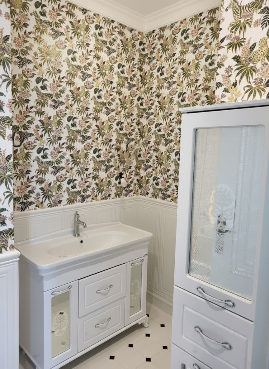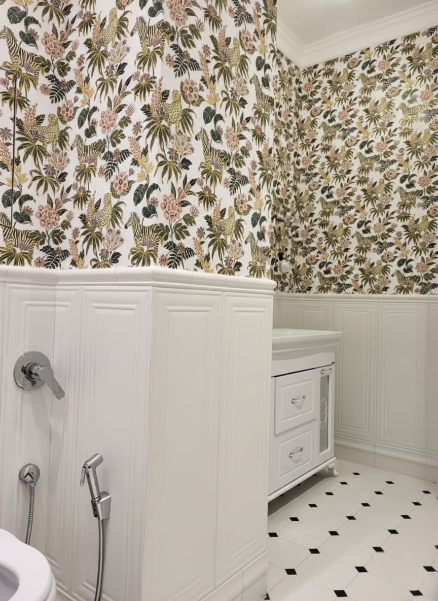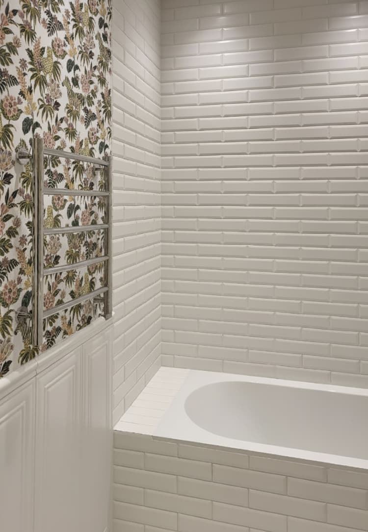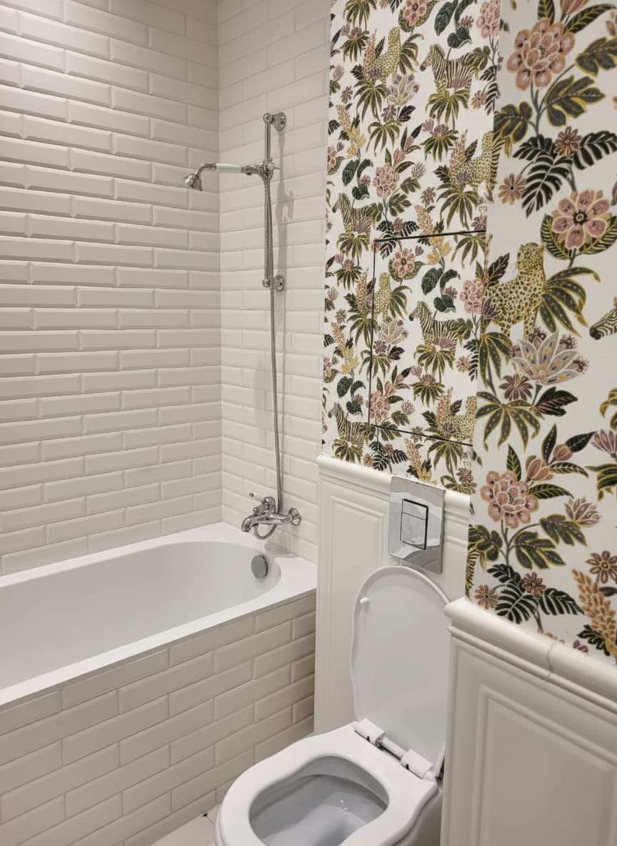 Санузел — одна из самых выразительных зон квартиры. Здесь реализована стилистика старой доброй Англии: нижняя часть стен выложена плиткой с фрезеровкой, а верх — оклеен влагостойкими обоями с ярким принтом. Стены подготовлены специальным образом — использовались влагостойкие цементные составы, а сами обои покрыты водоотталкивающим лаком.