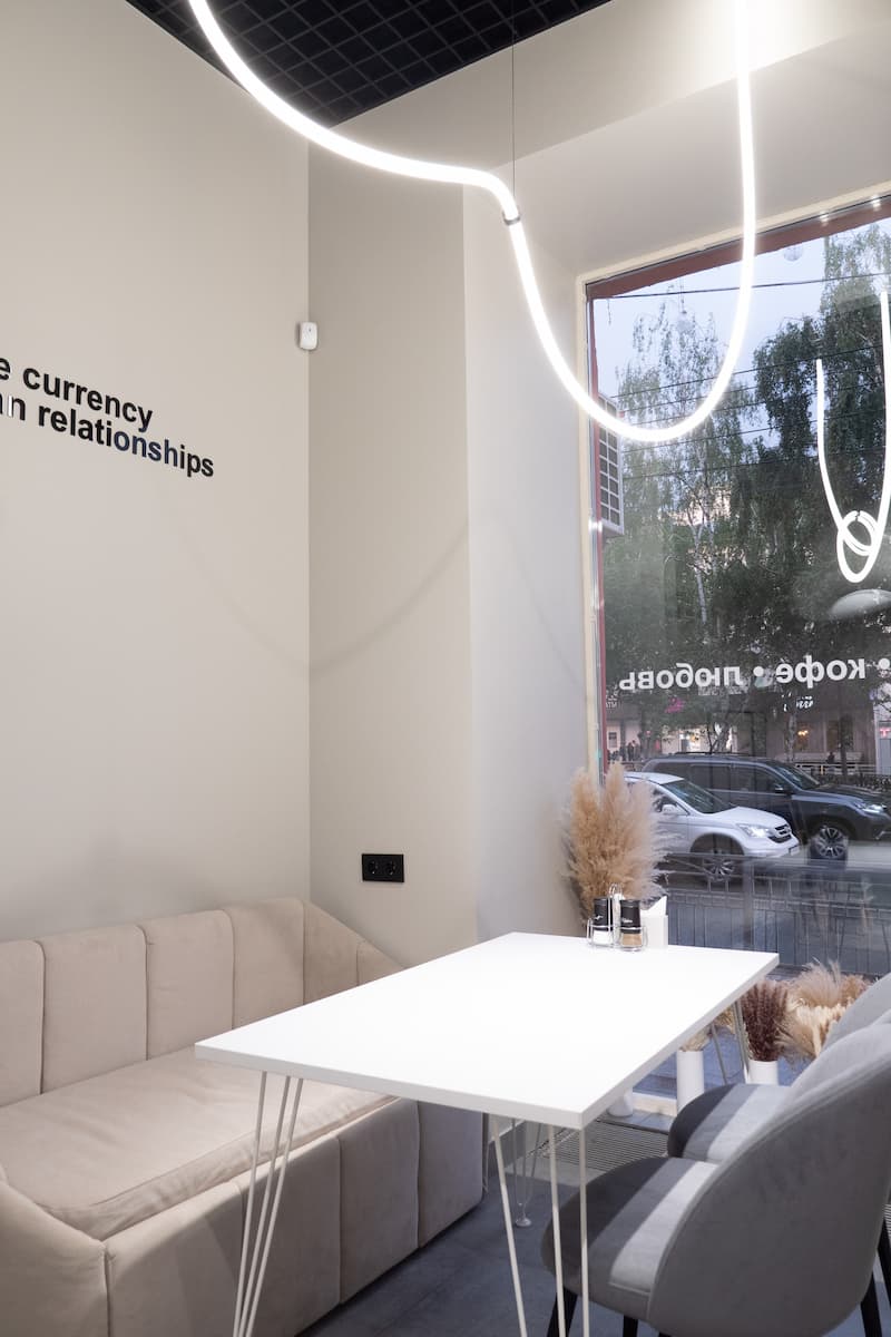 На потолке применили потолок грильято, который уместно вписывается в концепцию кофейни и сочетается с дизайнерским освещением. Освещение – изюминка этого проекта. Большие, но легкие светильники, напоминающие облака или зефир смотрятся современно и необычно.