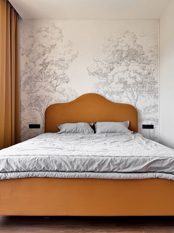 - Общие зоны — чистые линии, минимум лишнего, много воздуха и тепла за счёт деревянного пола, тёплого света и акцентного текстиля (горчичные шторы — в точку!).