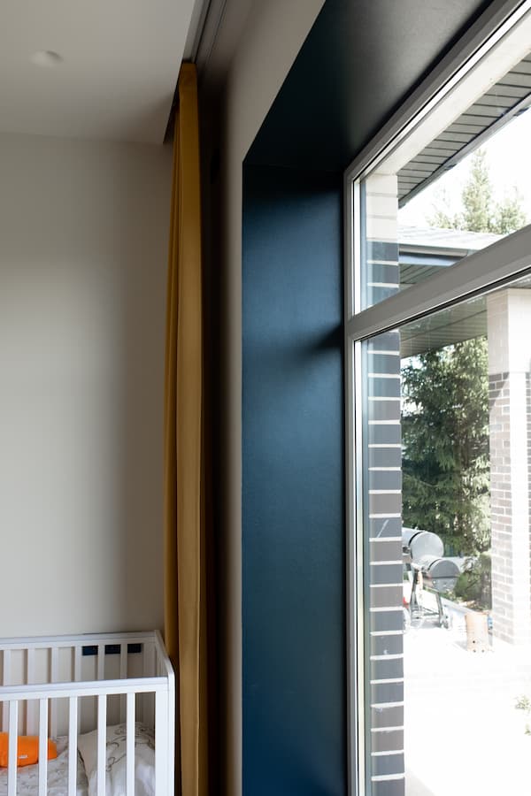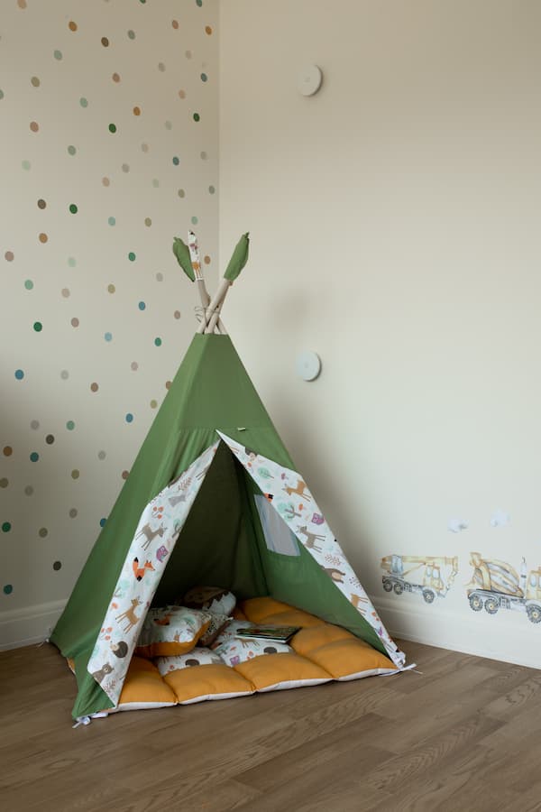 - Детская — яркая, но не вычурная. Горошек на стенах, зелёный вигвам, наклейки с техникой и большие окна — всё, чтобы ребёнку было уютно, интересно и безопасно.