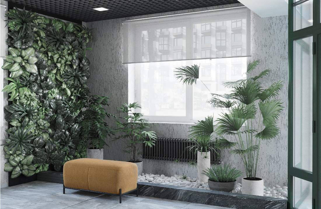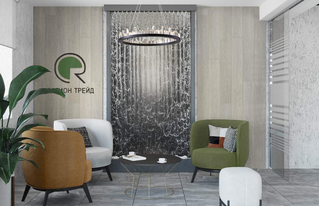 Входная зона офиса обладает уникальным дизайном интерьера, где использованы природные цвета, в основном оттенки серого и зеленый. Однако, настоящей изюминкой помещения является стена с водопадом, создающим атмосферу умиротворения и естественной красоты. Вдобавок к этому, здесь можно увидеть множество живых цветов, расположенных в разных уголках помещения, создающих яркие и живые акценты. Но настоящим украшением входной зоны стала зеленая стена, состоящая из разнообразных растений, которая придает интерьеру особый шарм и гармонию с природой. Это место не только впечатляет своей красотой, но и создает атмосферу комфорта и релаксации, встречая гостей офиса в самом начале их визита.
