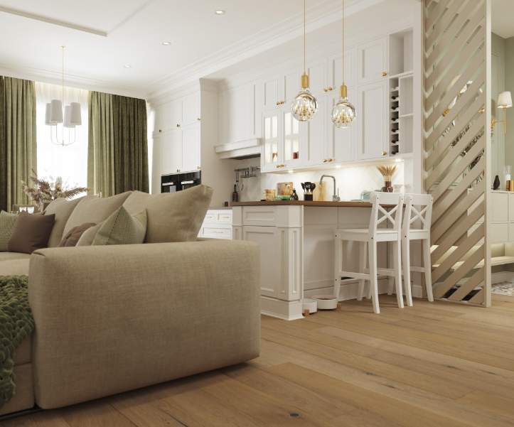 Интерьер этой трехкомнатной квартиры раскрывает в себе удивительное сочетание современности и классического стиля. Этот дом наполнен элементами английской классики, которые легко просматриваются в кухне-гостиной и спальне.